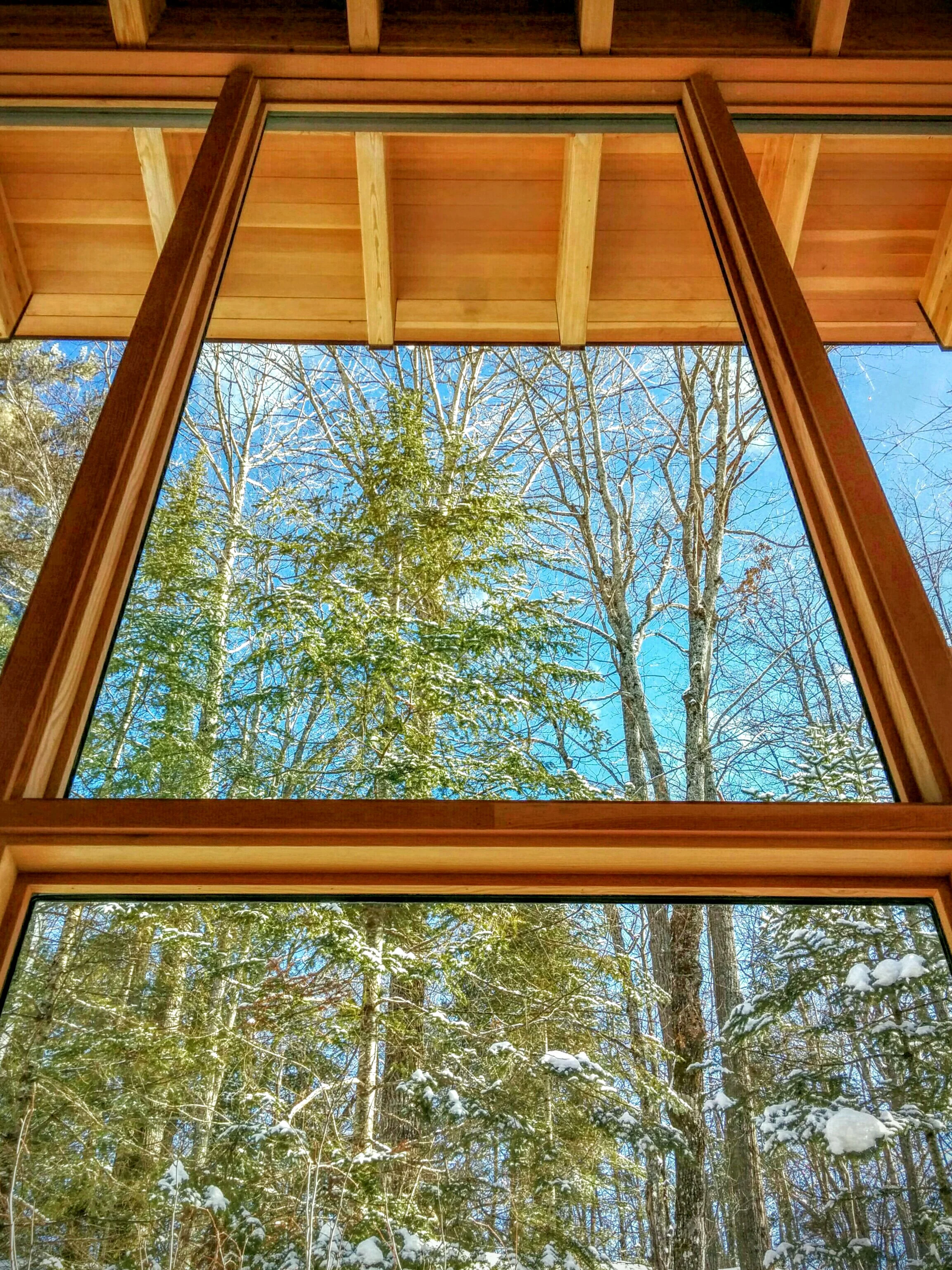 Soft lumberjack plaid in our spacious Upper Guest Bedroom oozes woodland relaxation. Windows on three sides, a spacious king bed and beautiful views over the forest and lake create an inside-outside vibe. A cosy palette of red, grey and onyx, natural fir built-ins and Vintage memorabilia create a casual yet luxurious space. The Upper Guest bathroom is adjacent, with inside and outside vanities, rain shower, tub, Aveda toiletries and handcrafted forest-green Heath ceramic wall tiles.